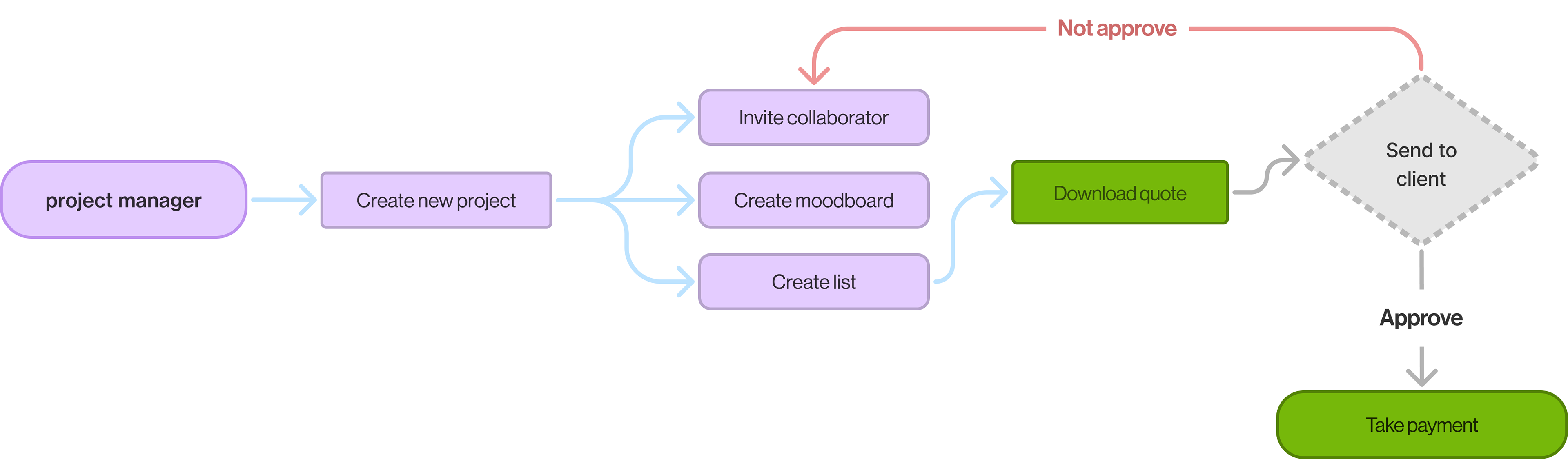 To kick off a project, the team must create detailed proposal that includes product specifications, pricing, conceptual designs, and other project-related details. Unfortunately at the moment the team relies on three to four different software tools—such as Specbooks, LightSpeed, and QuoteMachine—to generate a single proposal. This current task-flow is both time-consuming and costly.